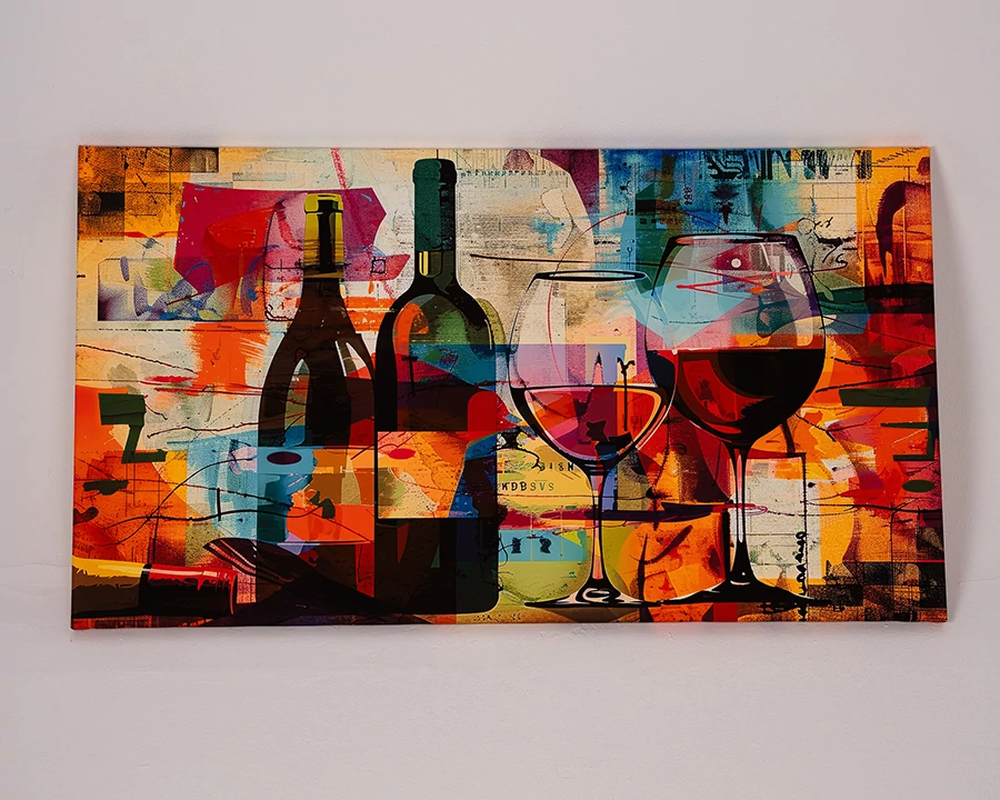 Egy vászonkép, ami szó szerint életre kelti a bort. Ez az 50x90 cm-es, színes borélmény-kép tele van energiával és hangulattal – borospalackok, poharak és szőlőfürtök köszönnek vissza egy modern, kollázsszerű grafikai világban. Színes és lendületes stílusával tökéletes dekoráció lehet étkezőkben, borbárokban vagy otthoni konyhákban. Boros ajándékként is kiváló ötlet egy borrajongó számára, aki nemcsak inni, hanem „látni” is szereti a bort.