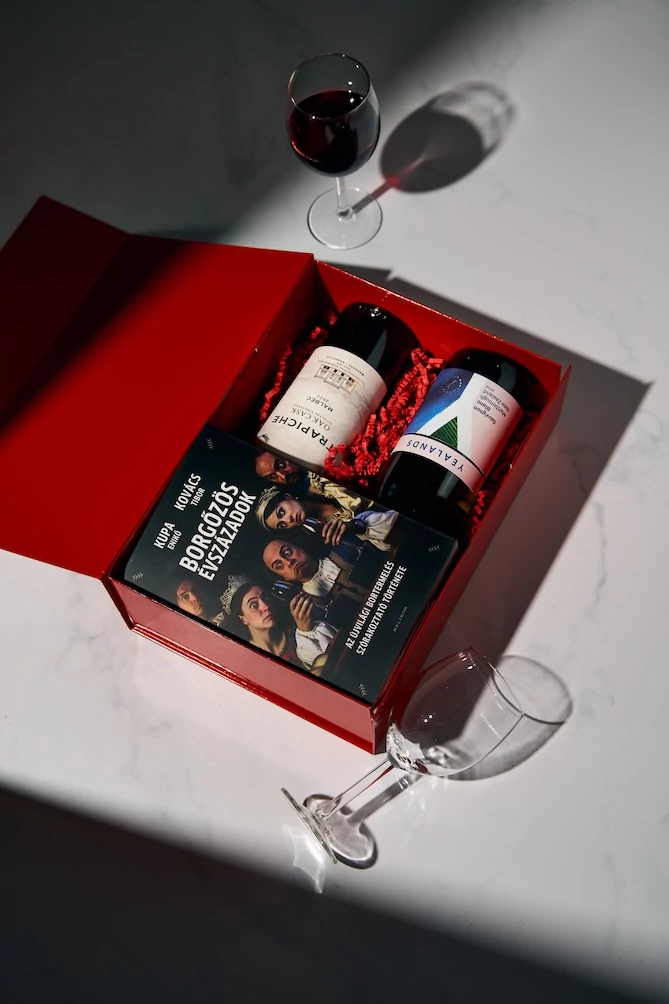 Szép mágneszáras dobozban egy nagyon szórakoztató könyv. Ideális karácsonyi ajándék. Bármilyen bor rendelhető bele. A borokat nem tartalmazza az ár.